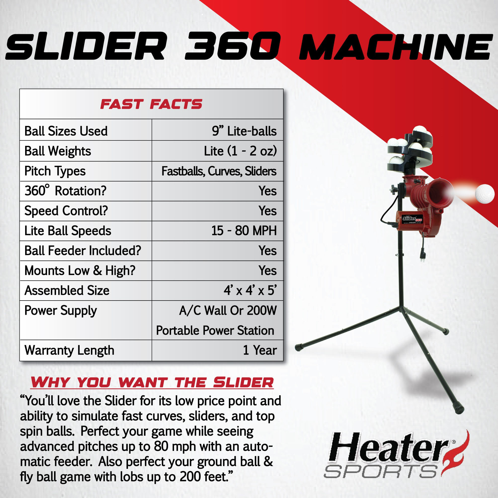 The Slider Lite-Ball Pitching Machine from Heater Sports pitches fastballs, inside breaking balls, and outside breaking balls. The powerful A/C motor throws Lite-Balls at variable speeds up to 60 miles per hour. The Slider also includes an automatic ball feeder that holds 12 Lite-Balls. Just turn on the feeder and each ball is dropped into the Slider pitching machine every 9 seconds. Take batting practice without the need for another player. And with a simple swivel adjustment you can also hit fastballs and curve balls. Plug the Slider into any standard wall outlet or battery pack. You may also consider the optional Xtender Home Batting Cages and improve your hitting right in your own backyard.